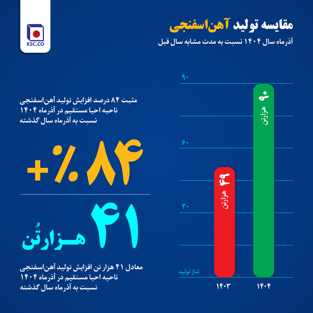 در این ماه، تولید آهن اسفنجی از ۴۹ به ۹۰ هزار تن افزایش یافته است؛ رشدی معادل ۴۱ هزار تن که به معنای افزایش حدود ۸۴ درصدی تولید ماهانه در این ناحیه است.