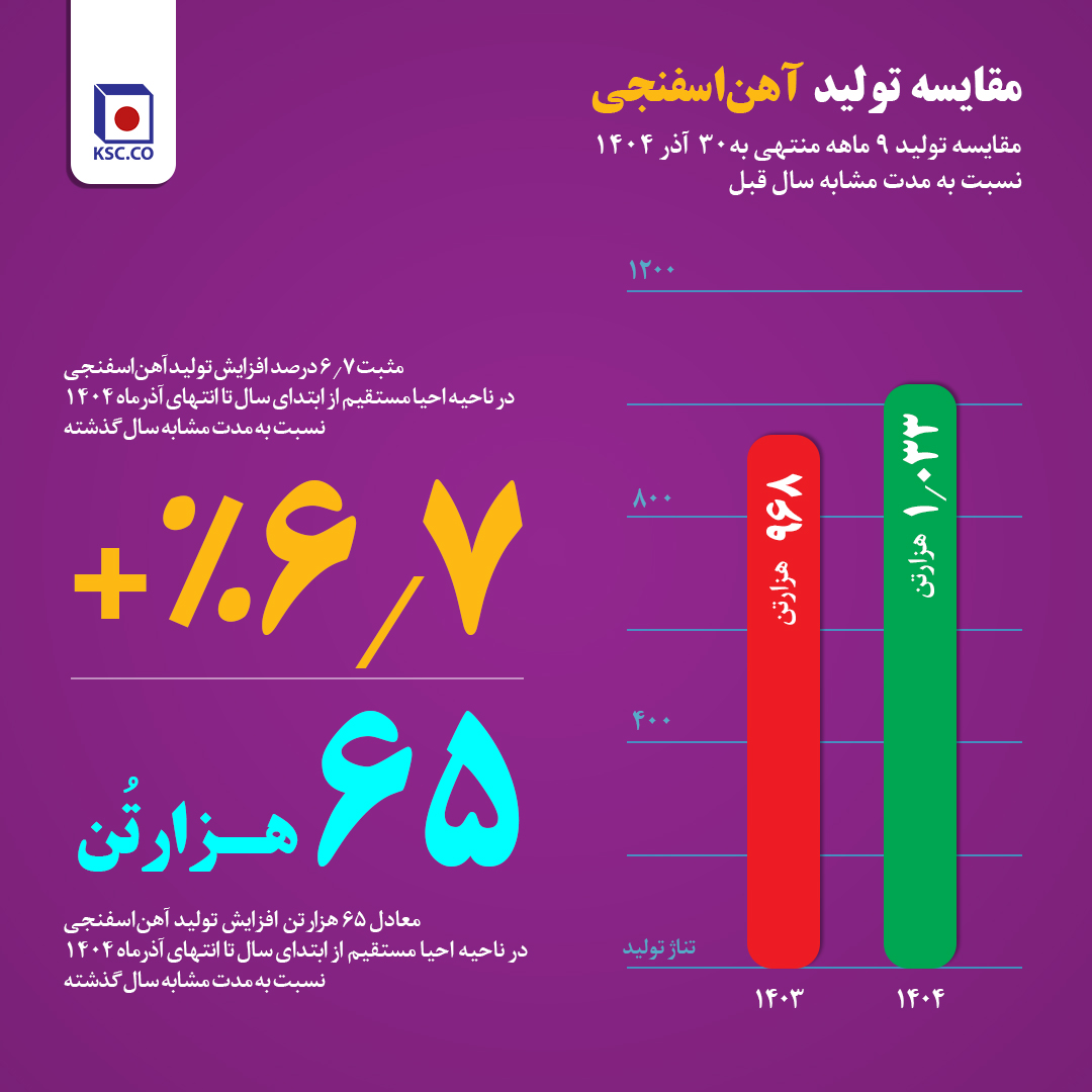 بنا بر این گزارش، در ناحیه احیا مستقیم فولاد خراسان تولید آهن اسفنجی را از ۹۶۸ هزار تن در ۹ ماهه پارسال به ۱میلیون و ۳۳ هزار تن در سال جاری رساند؛ افزایشی در حدود ۶۵ هزار تن که رشد نزدیک به ۶.۷ درصد را نشان میدهد و نقش کلیدی این ناحیه را در پایداری جریان تولید فولاد برجسته میکند.